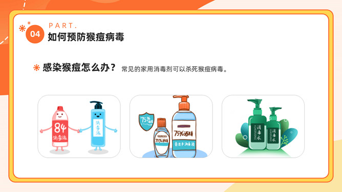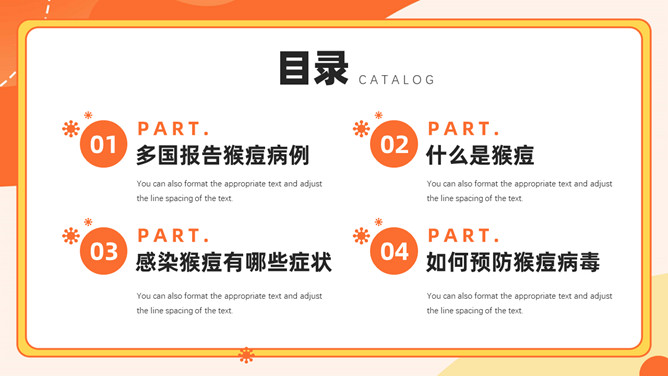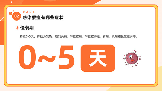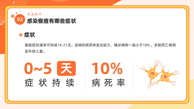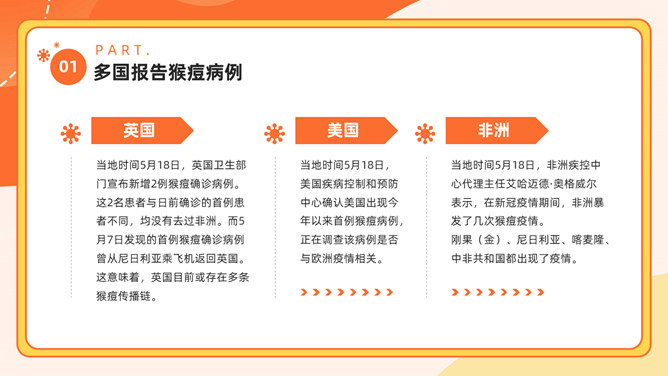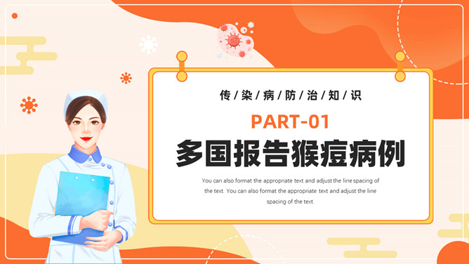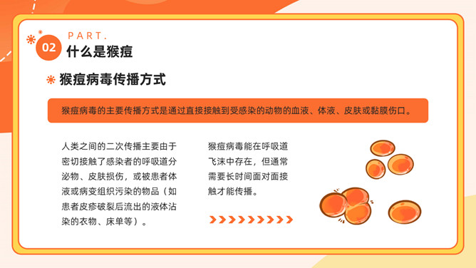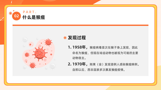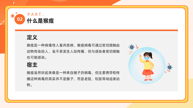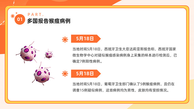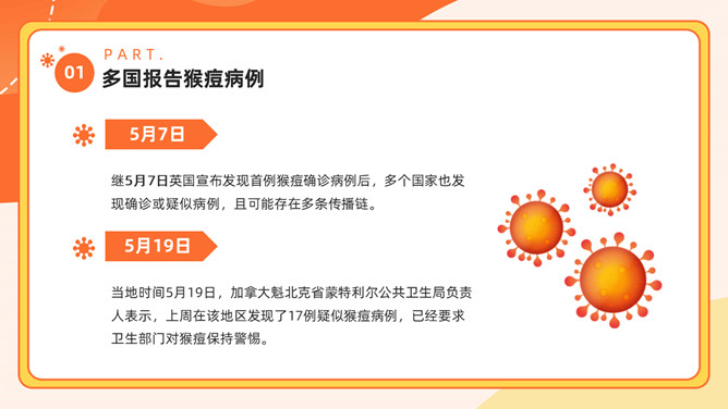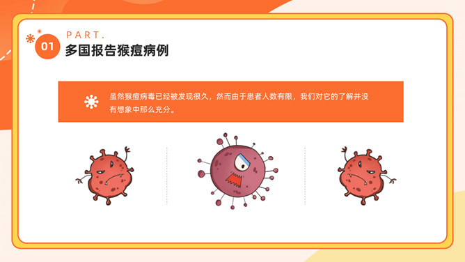 猴痘病毒知识科普PPT模板。内容包括多国报告猴痘病例、什么是猴痘、感染猴痘有哪些症状、如何预防猴痘病毒。