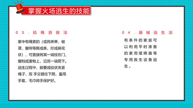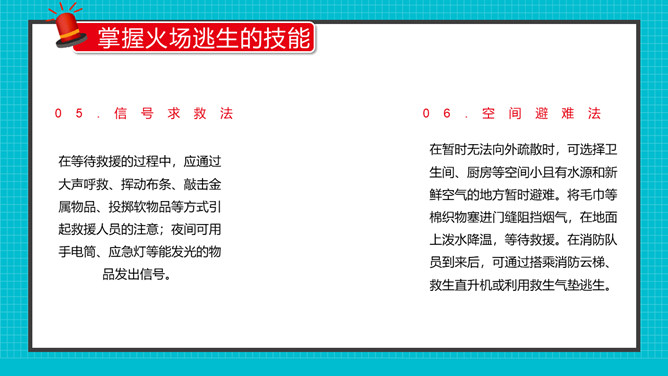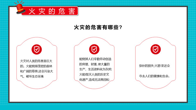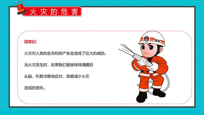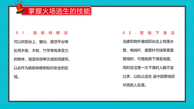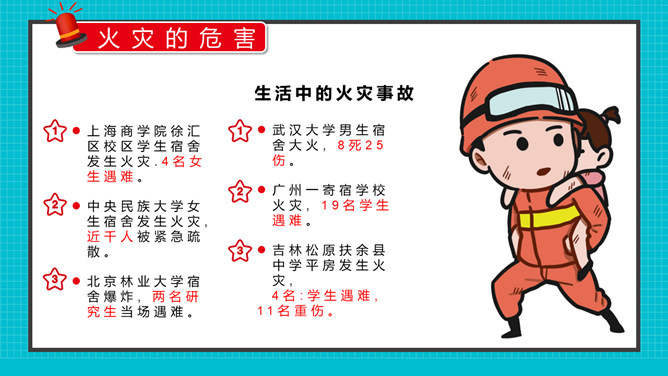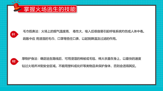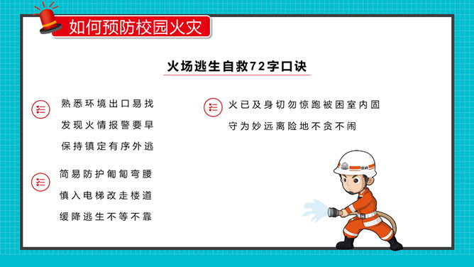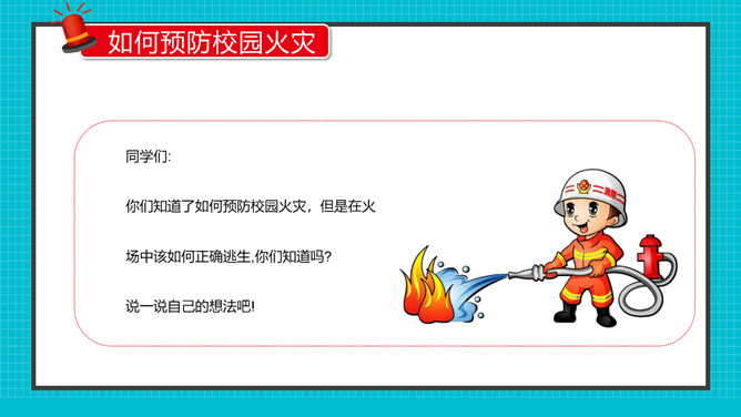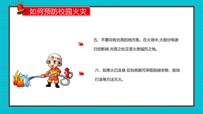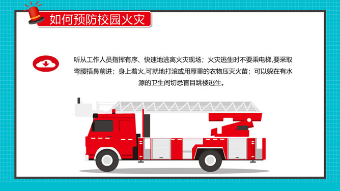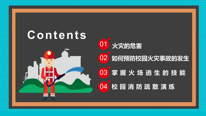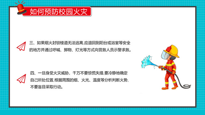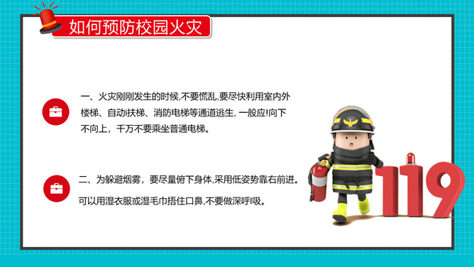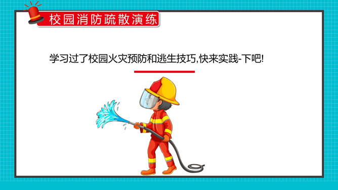 校园消防疏散演习PPT模板。内容包括火灾的危害、如何预防校园火灾事故的发生、掌握火场逃生的技能、校园消防疏散演练。