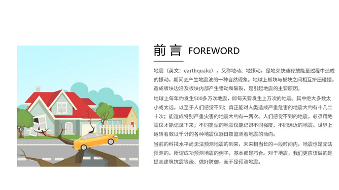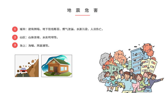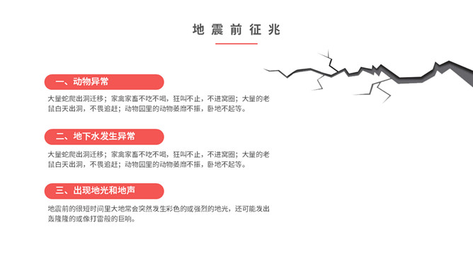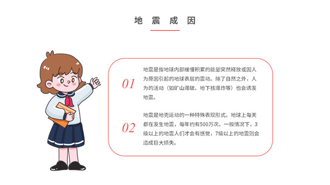 内容包括地震成因、地震危害、地震预防、地震前征兆、地震发生时如何逃生、怎样救助被埋压人员、学校防震措施、避灾自救口诀。