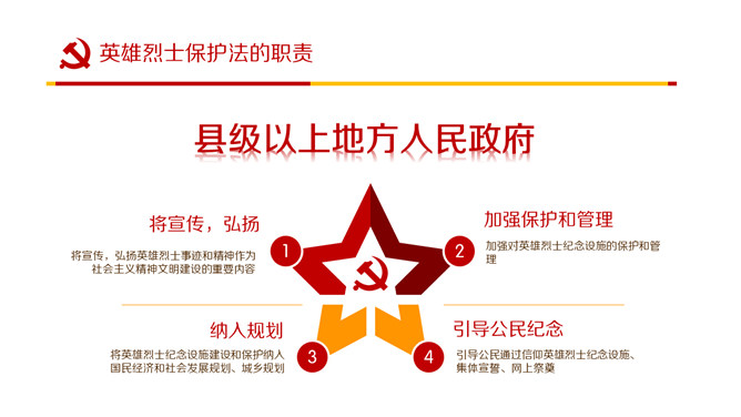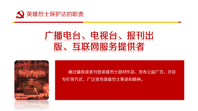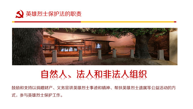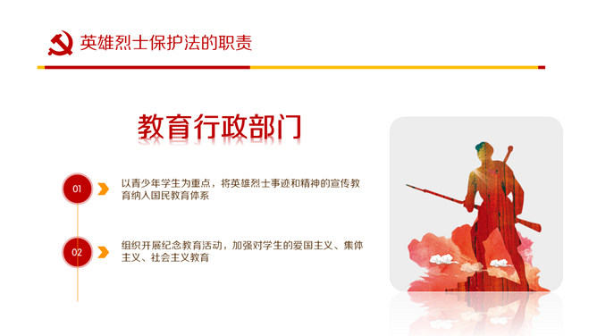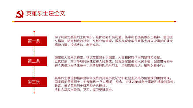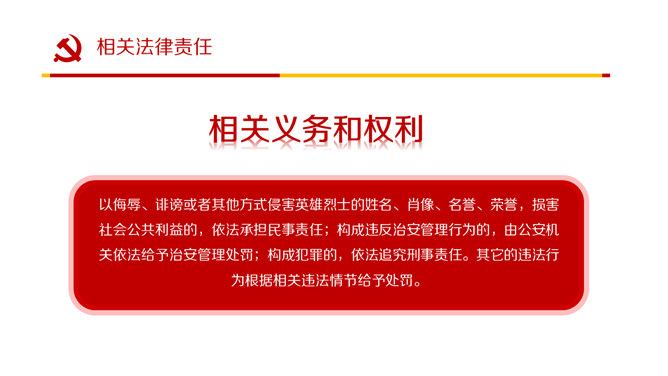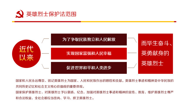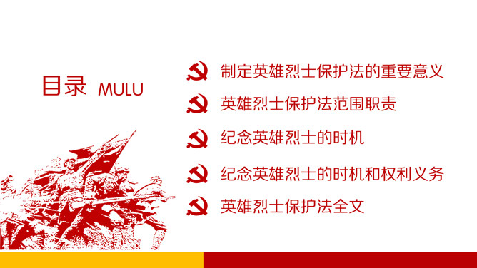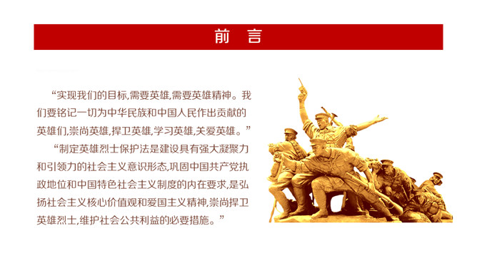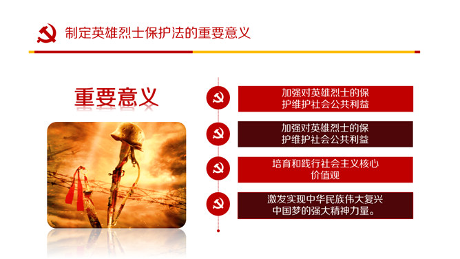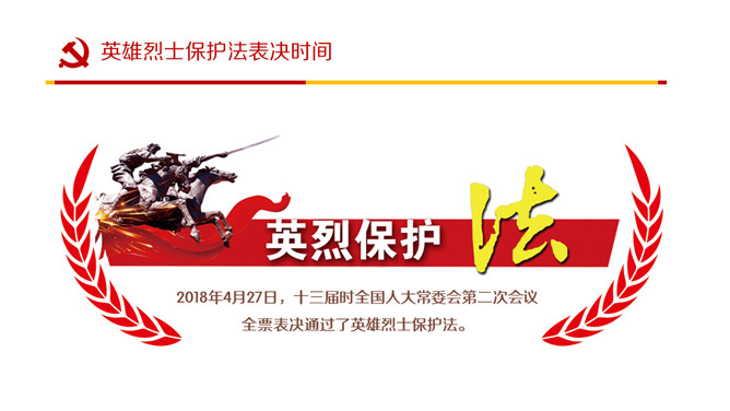 英雄烈士保护法学习PPT课件模板。内容包括制定英雄烈士保护法的重要意义、范围职责、时机和权利义务、英雄烈士保护法全文。