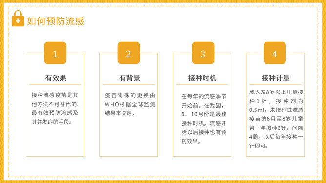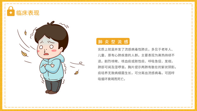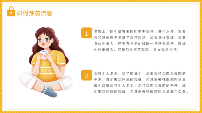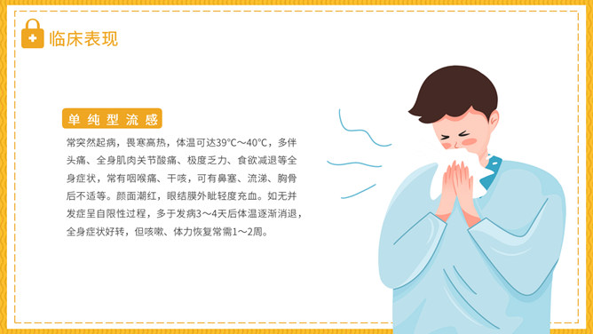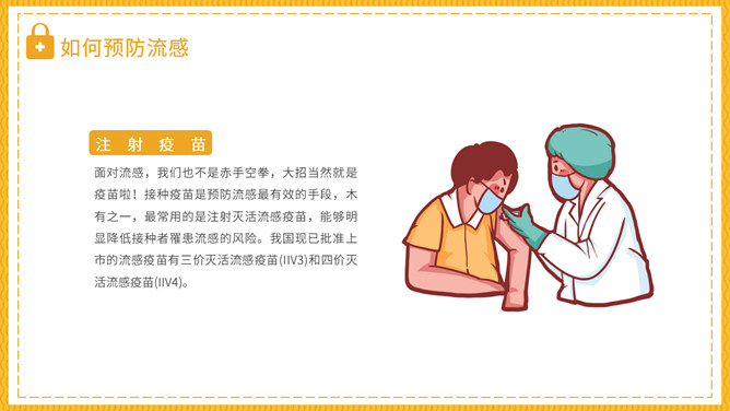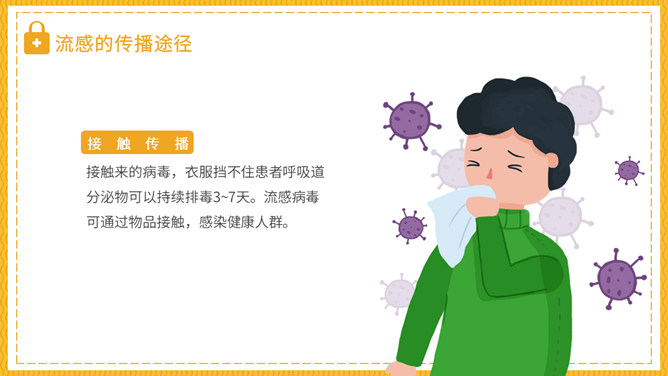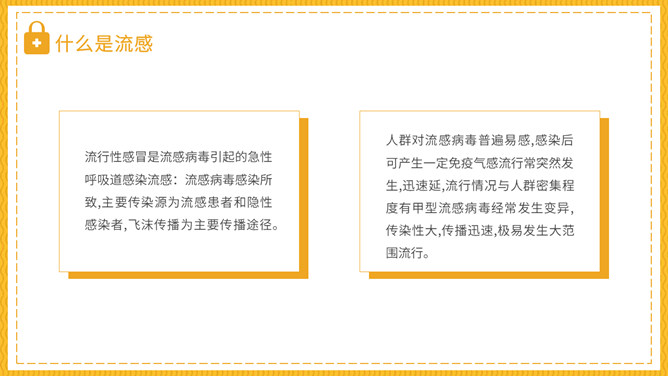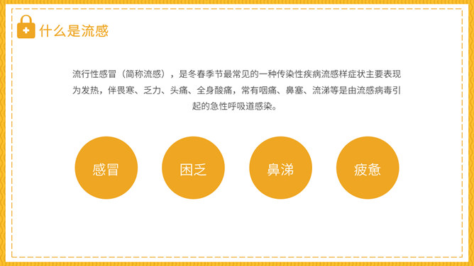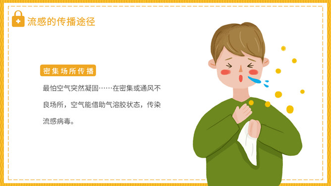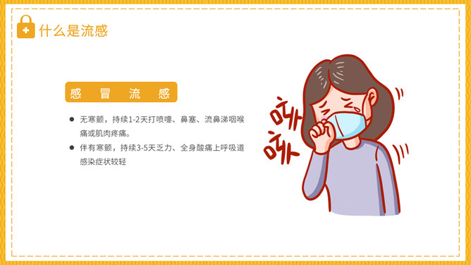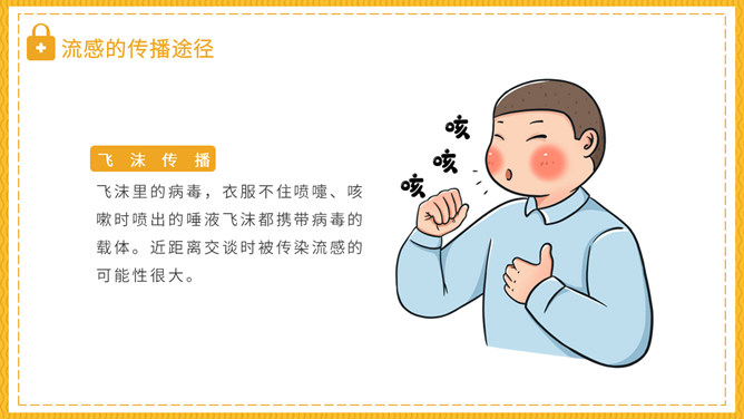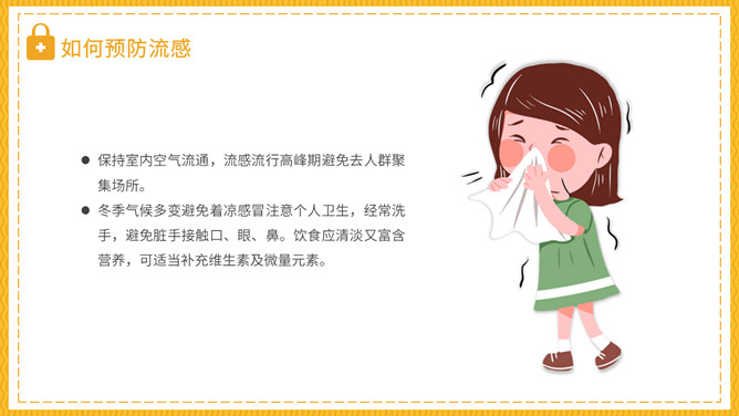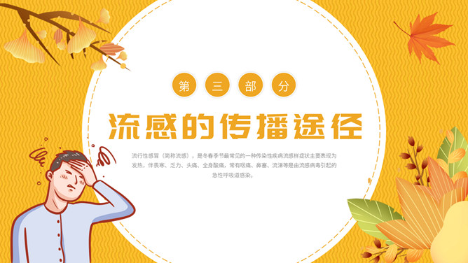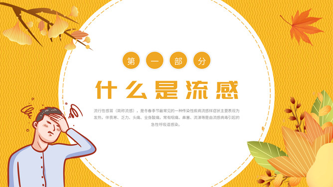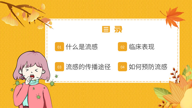 秋季流行感冒预防PPT模板。内容包括什么是流感、临床表现、流感的传播途径、如何预防流感。