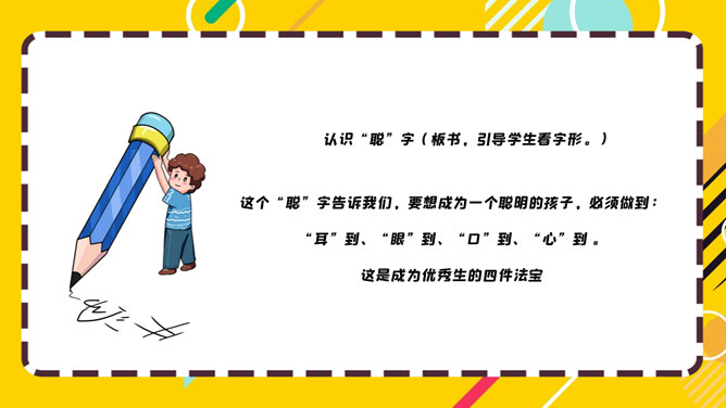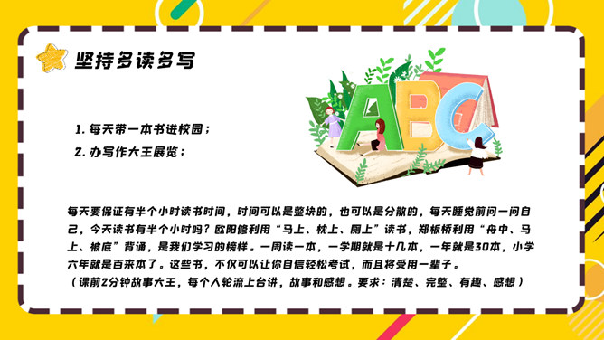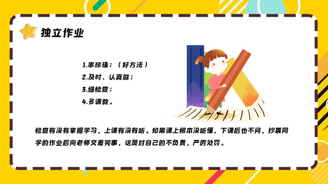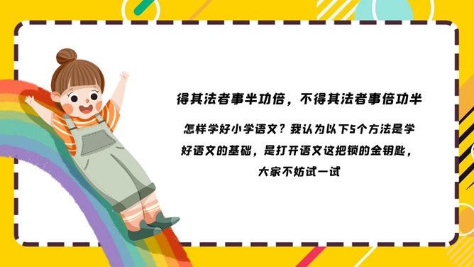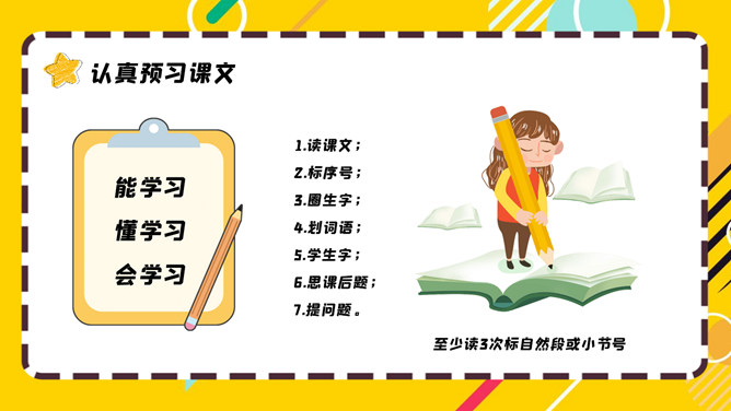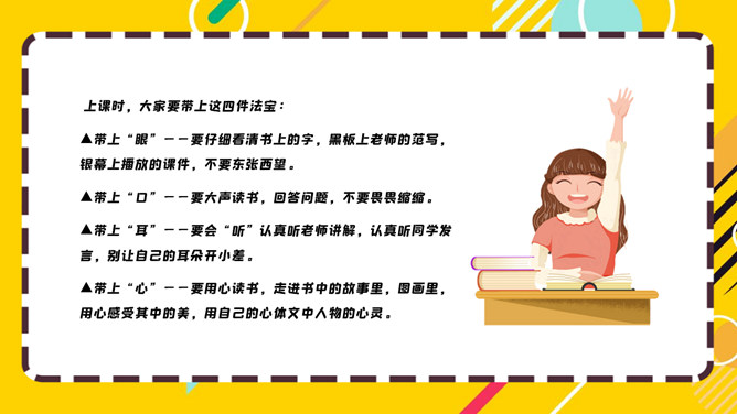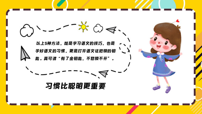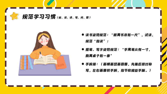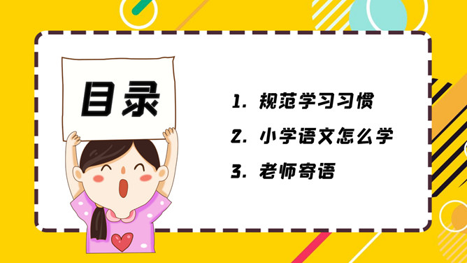 语文新学期开学第一课PPT模板。内容包括规范学习习惯、小学语文怎么学、老师寄语。
