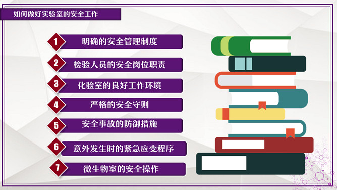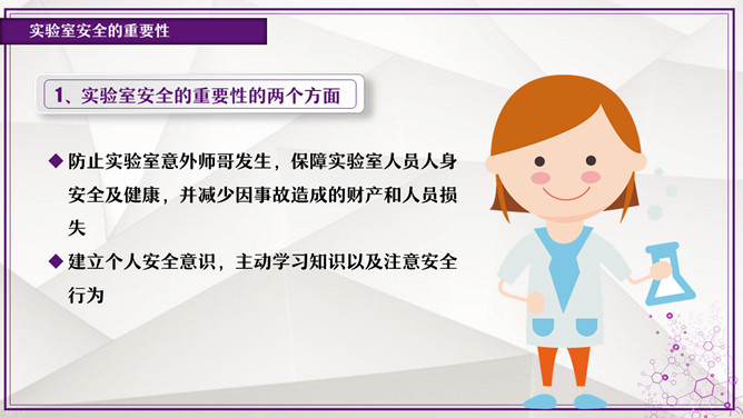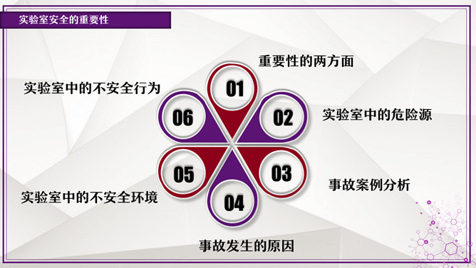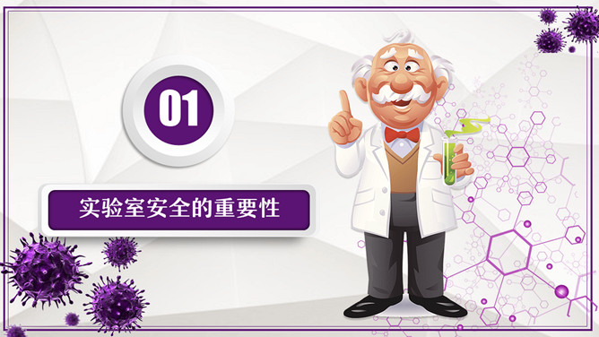 实验室安全教育培训PPT模板。内容包括实验室安全的重要性、危险化学品的使用和防护、认识实验室的危险、如何做好实验室的安全工作。