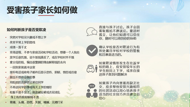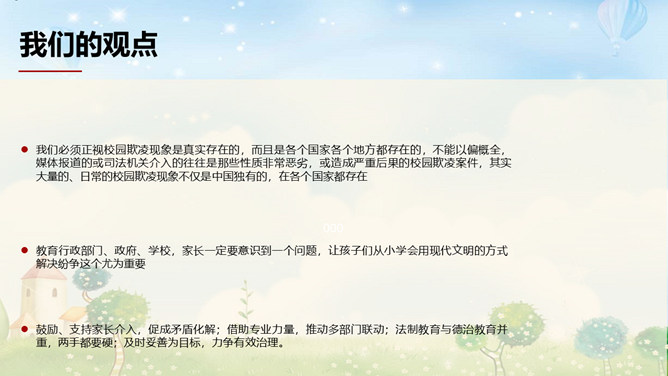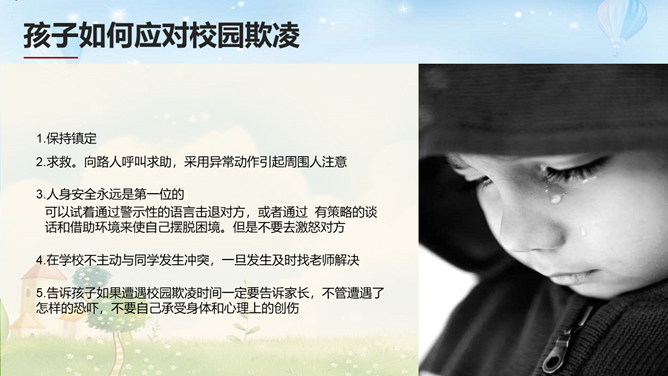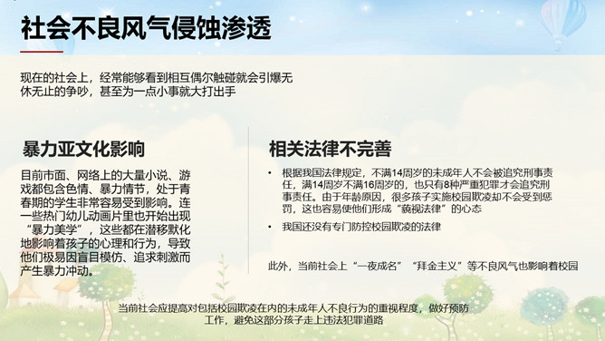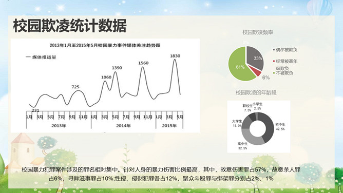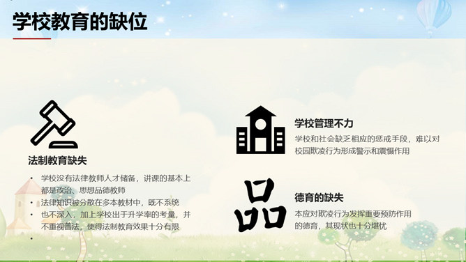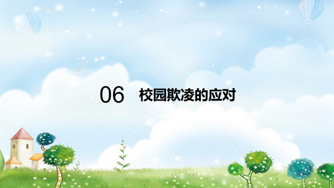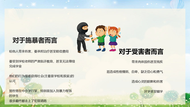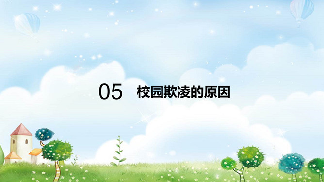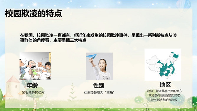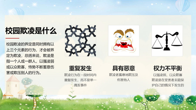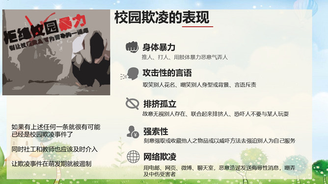 增加法制观念反校园欺凌PPT模板。内容包括校园欺凌是什么、校园欺凌的表现和特点、校园欺凌的危害、校园欺凌的原因和应对。