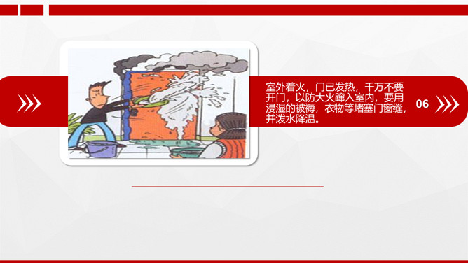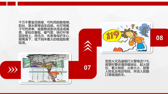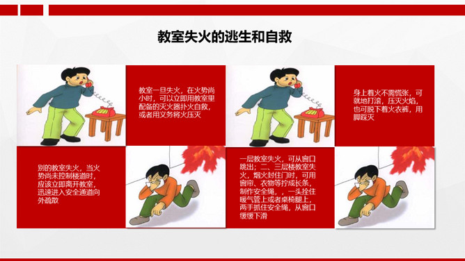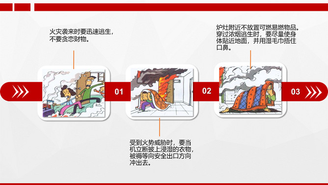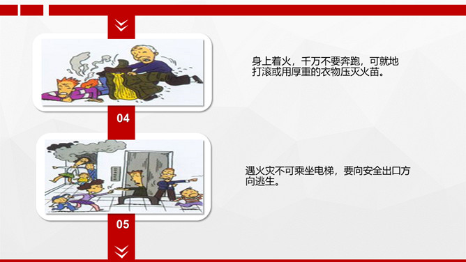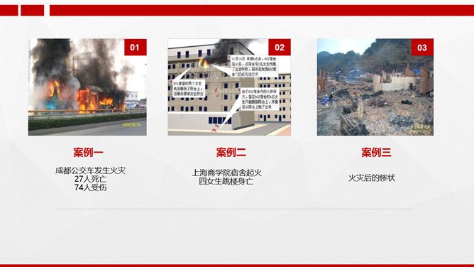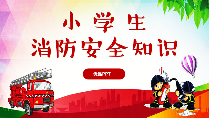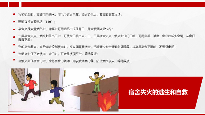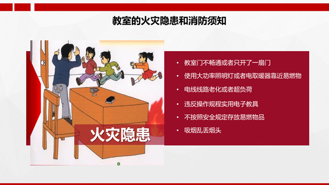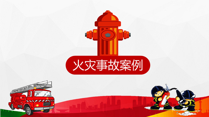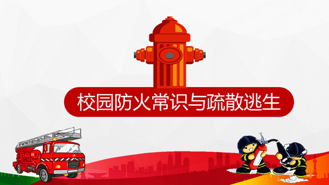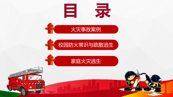 小学生消防安全知识教育班会PPT模板。内容包括火灾事故案例、校园防火常识与疏散逃生、家庭火灾逃生。