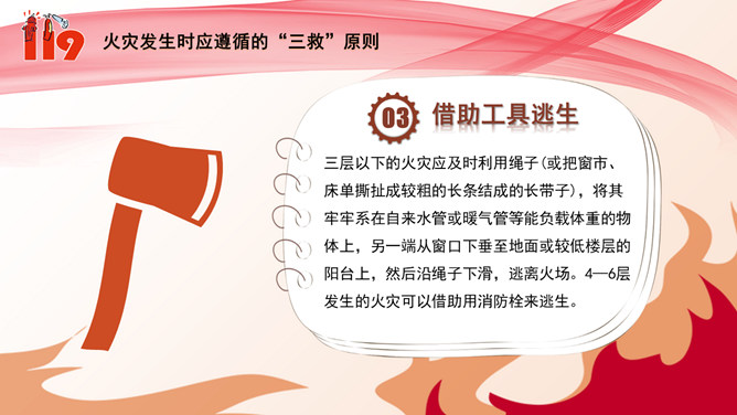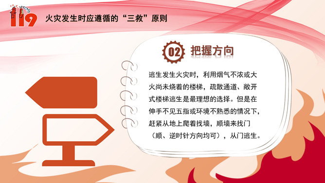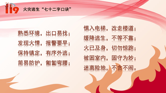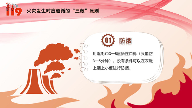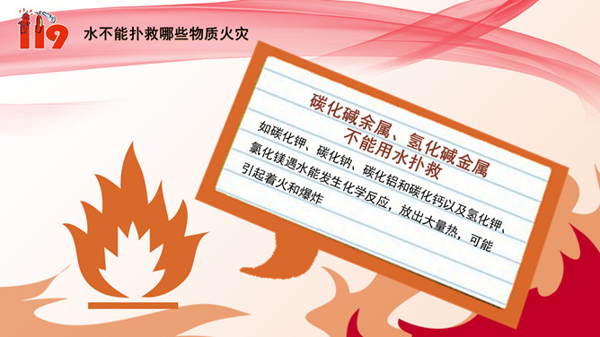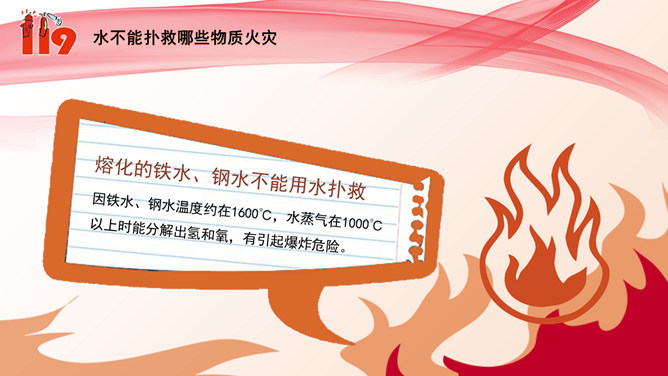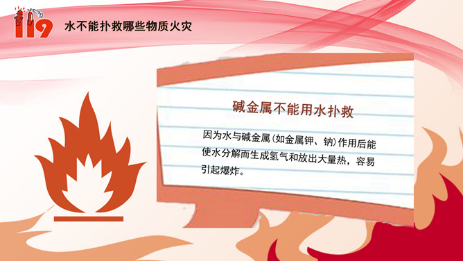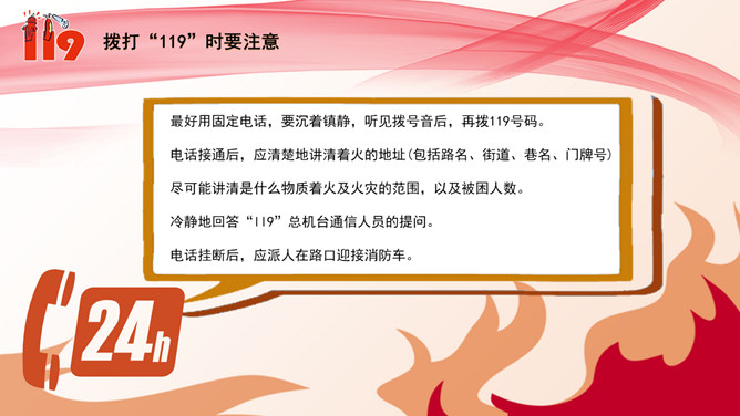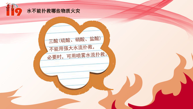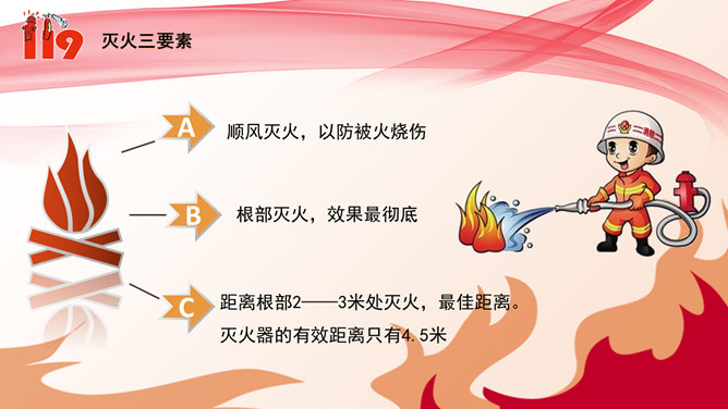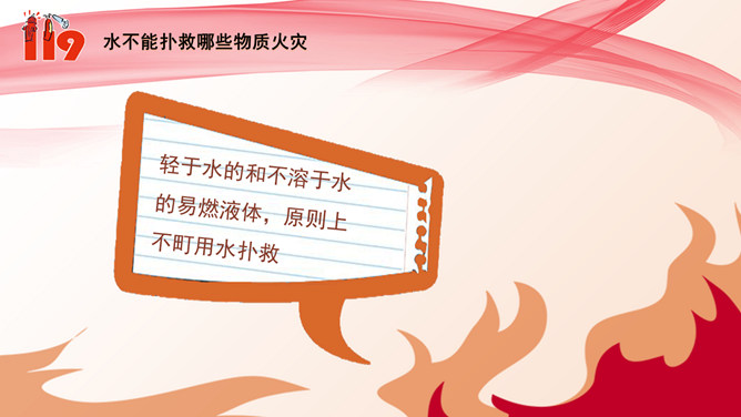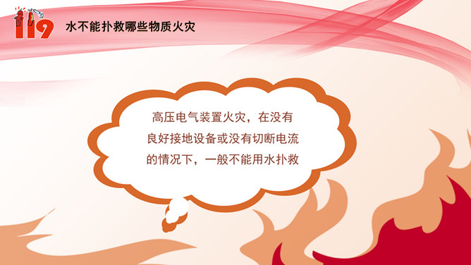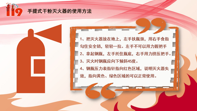 消防安全小常识课件PPT模板。内容包括发现火灾第一时间该怎么办、拨打“119”时要注意、灭火三要素、手提式干粉灭火器的使用方法、水不能扑救哪些物质火灾。