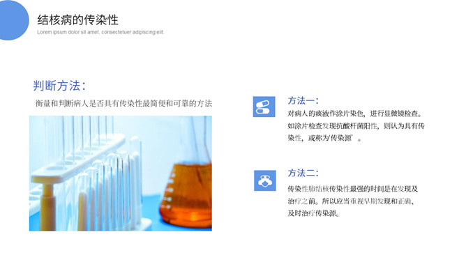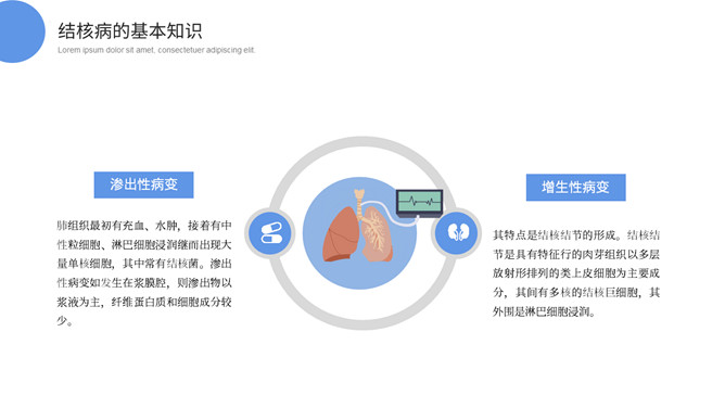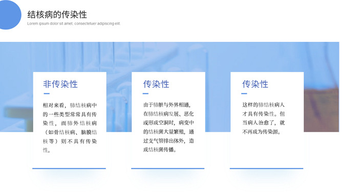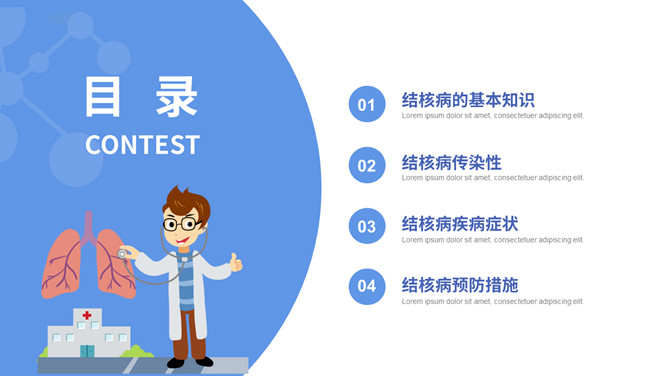 预防肺结核科普知识课件PPT模板。内容包括结核病的基本知识、传染性、疾病症状和预防措施。