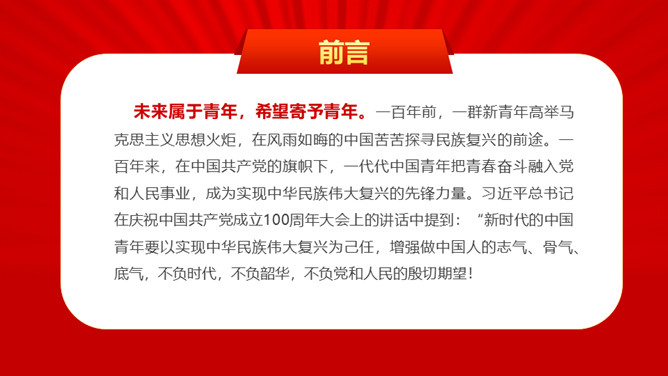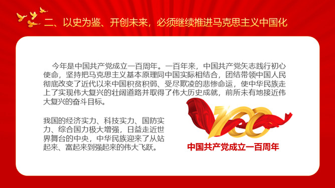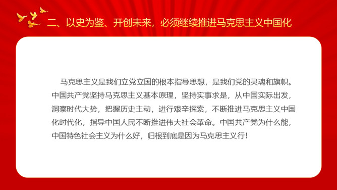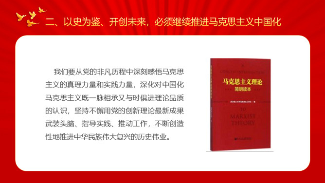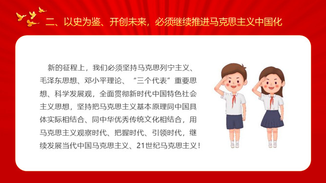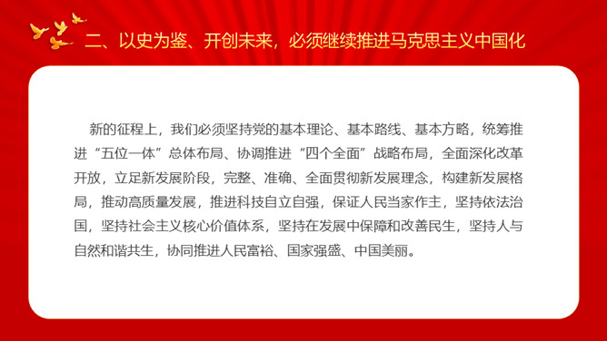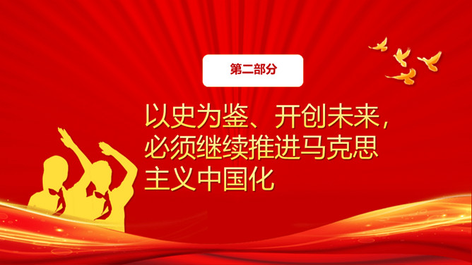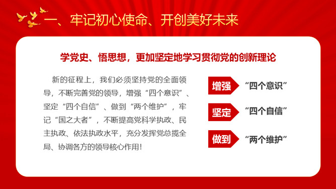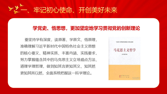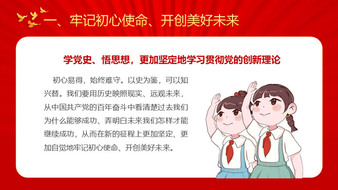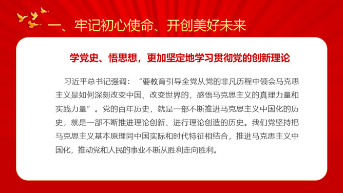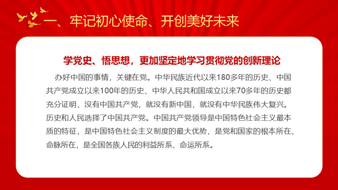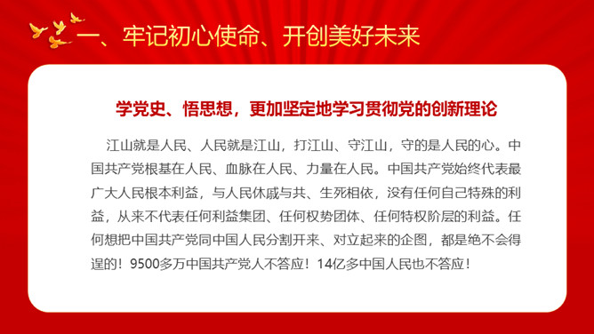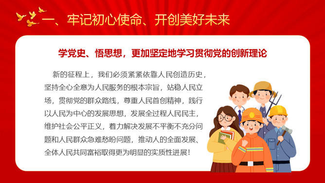 牢记初心使命开创美好未来PPT模板。内容包括牢记初心使命开创美好未来、必须继续推进马克思中国化、必须加快国防和军队现代化、必须不断推动构建人类命运共同体。