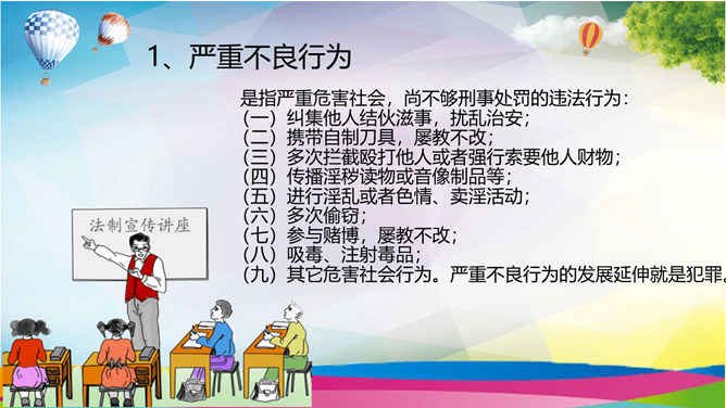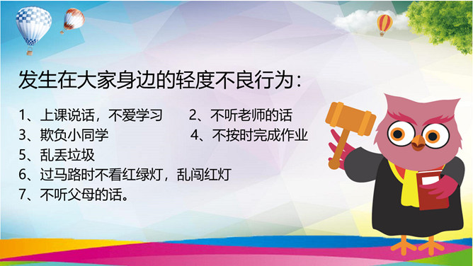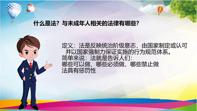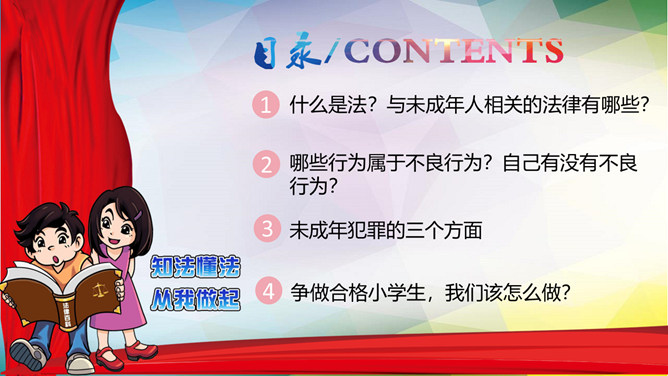 小学生法治教育班会PPT模板。什么是法?与未成年人相关的法律有哪些?哪些行为属于不良行为?自己有没有不良行为?未成年犯罪的三个方面。争做合格小学生,我们该怎么做?