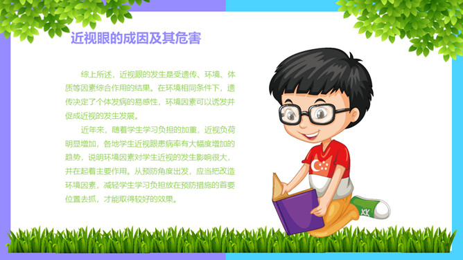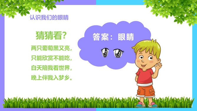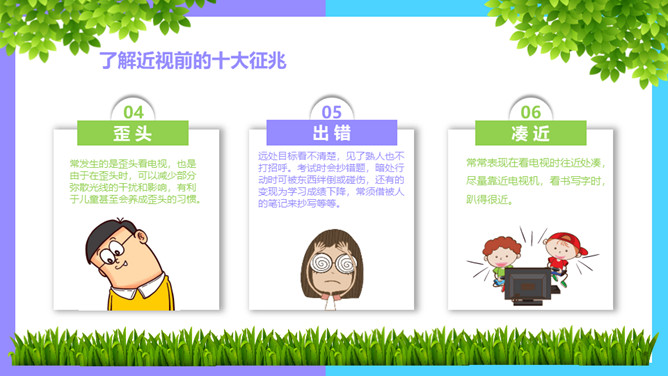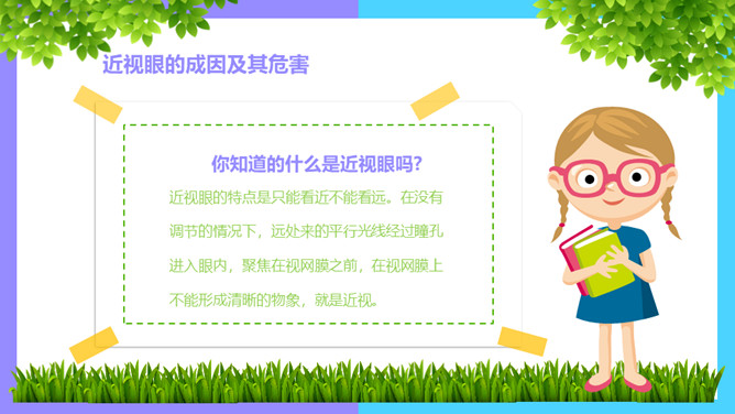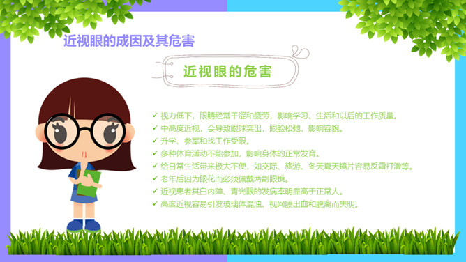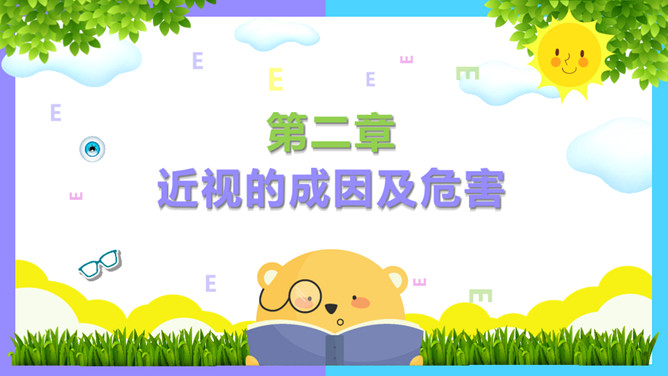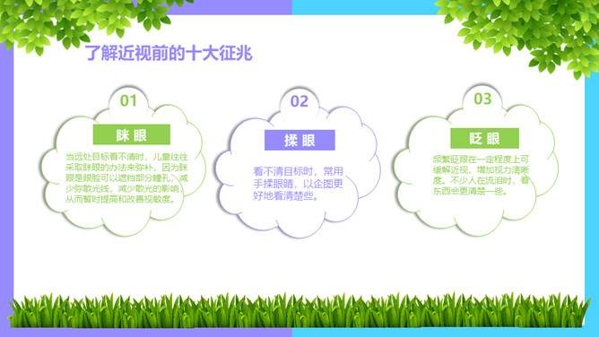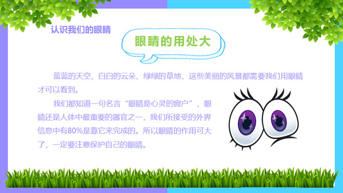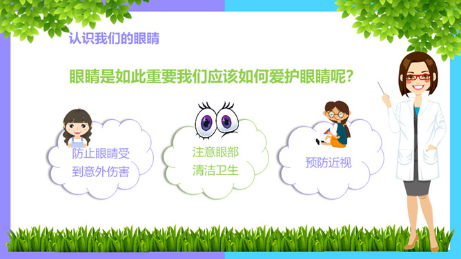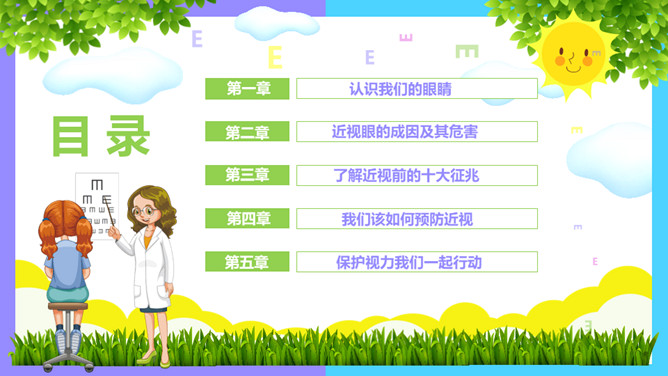 爱眼护眼保护视力课件PPT模板。内容包括认识我们的眼睛、近视眼的成因及其危害、了解近视前的十大征兆、我们该如何预防近视、保护视力我们一起行动。