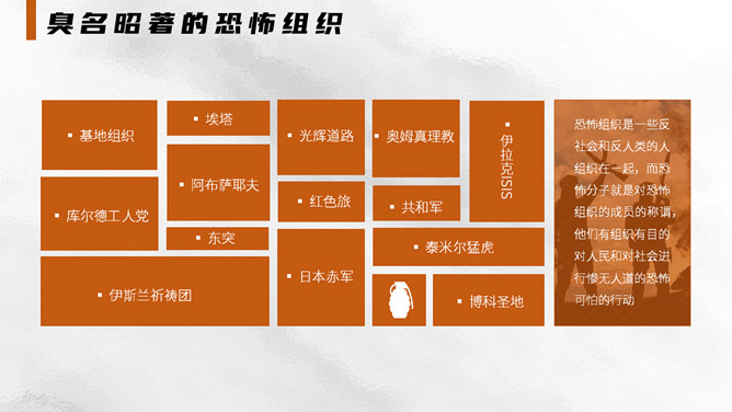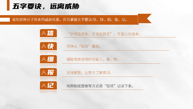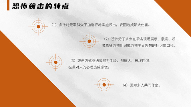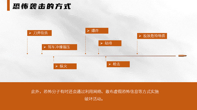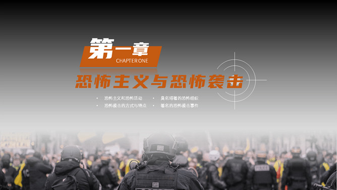 反恐防暴主题教育PPT模板。内容包括恐怖主义与恐怖袭击、如何识别恐怖袭击、恐怖袭击的应对。