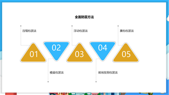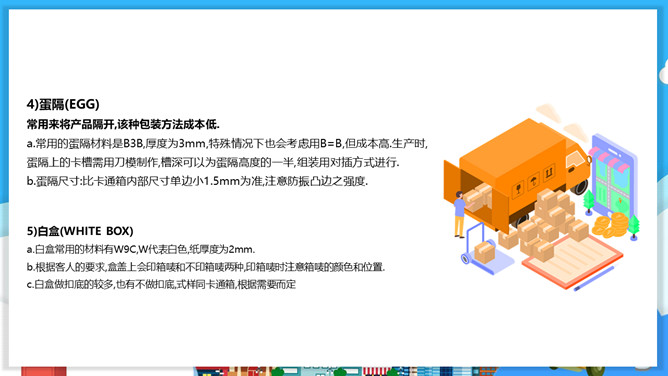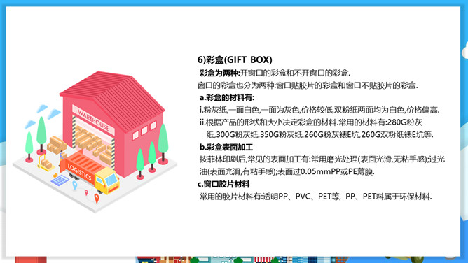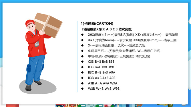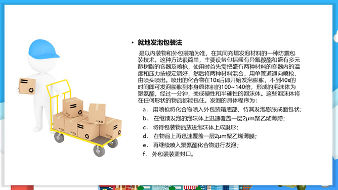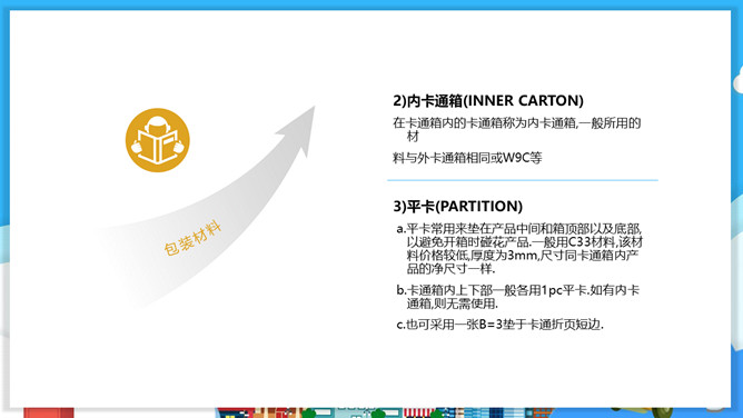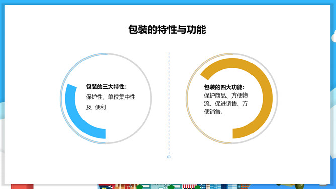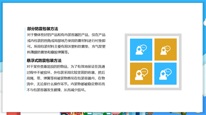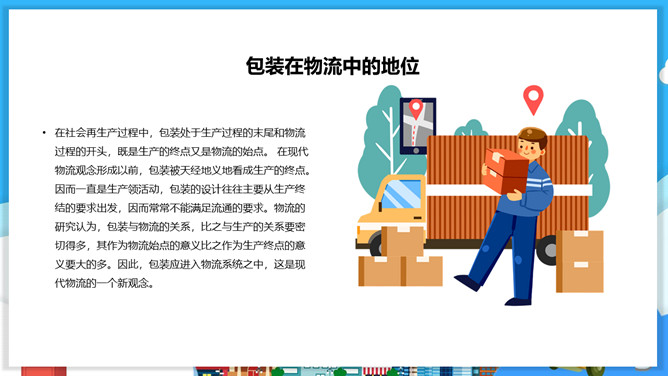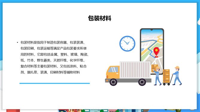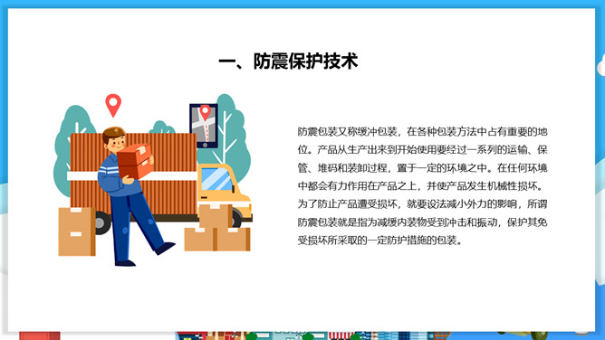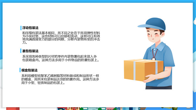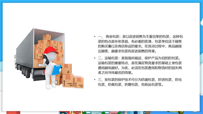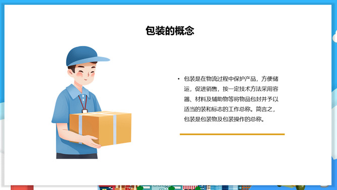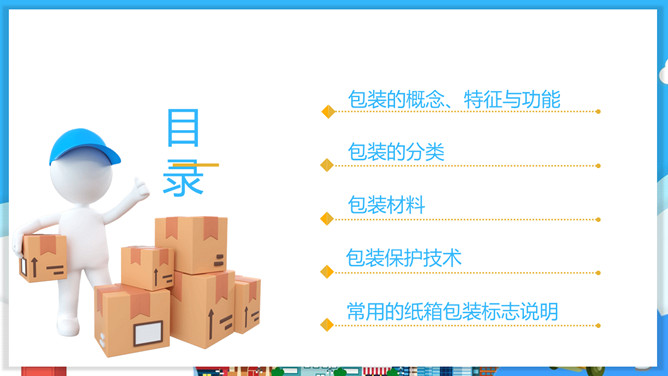 物流包装基本知识PPT模板。目录:包装的概念、特征与功能。包装的分类。包装材料。包装保护技术。常用的纸箱包装标志说明。