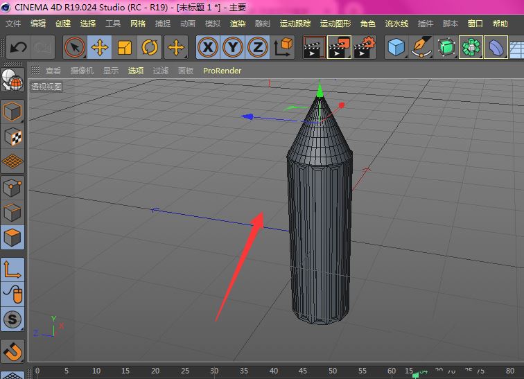 然后再增加一个圆锥体模型,调整大小放到上面,这样一个铅笔的造型就制作好了。