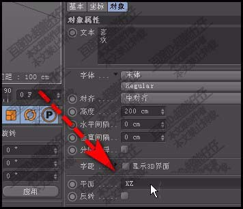 5、若想文字躺在地面上,那么,我们就要把平面这里,修改为:XZ