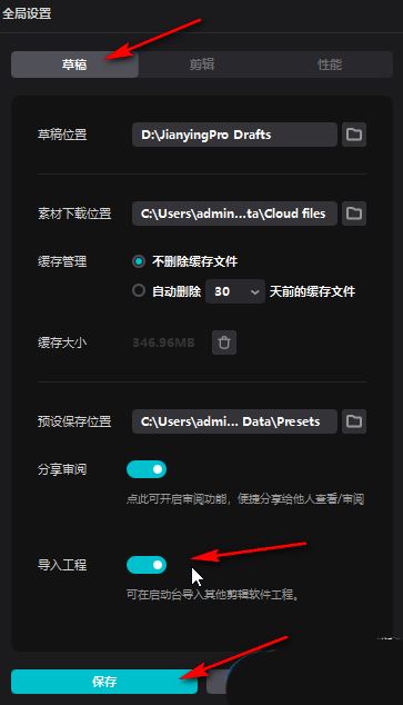 第三步:进入窗口后点击勾选“导入工程”,然后点击“保存”;