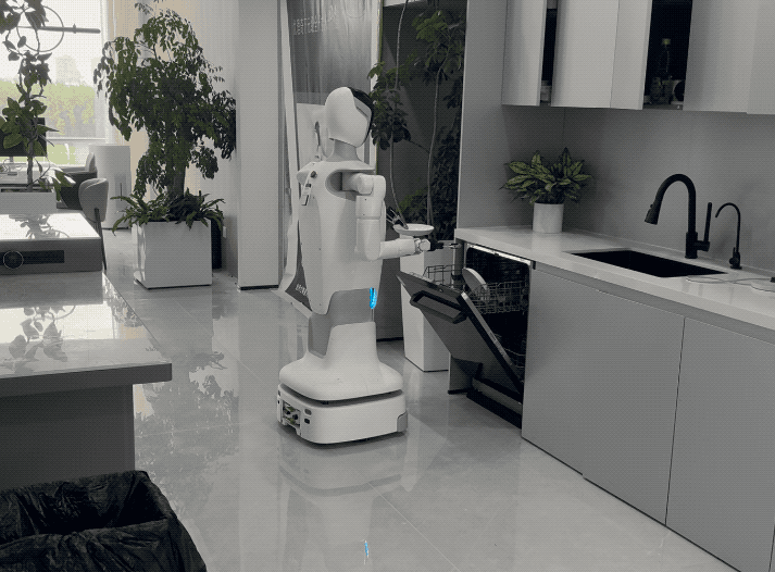 这是一个长序列任务,Wanda2.0 需要先找到盘子,抓取盘子,将盘子内的脏水倒空,放进洗碗机里,最后再将桌子上的卫生纸扔掉。我们将垃圾和盘子随意摆放进行了两次测试,机器人都顺利地完成了这个长序列任务。