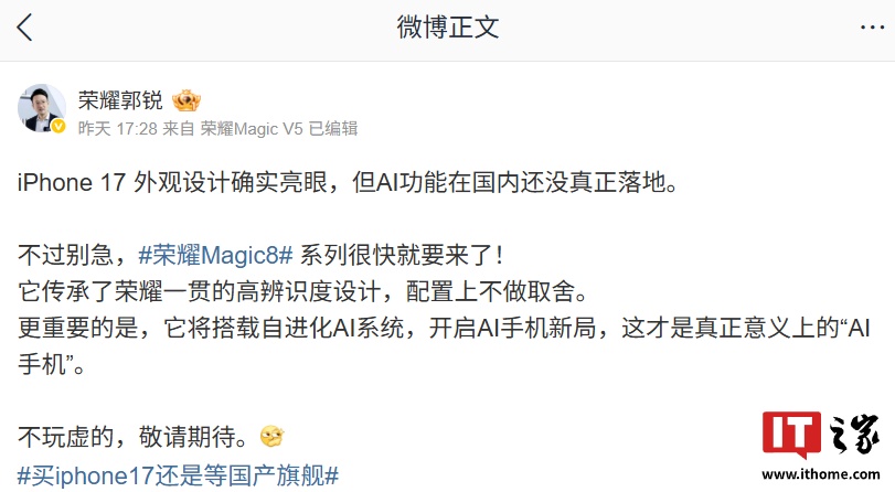alixixi 9 月 11 日消息,荣耀终端股份有限公司品牌营销总裁、集团首席营销官昨日发文“点评”了苹果 iPhone 17 系列和 iPhone Air 新机,称:“iPhone 17 外观设计确实亮眼,但 AI 功能在国内还没真正落地。”