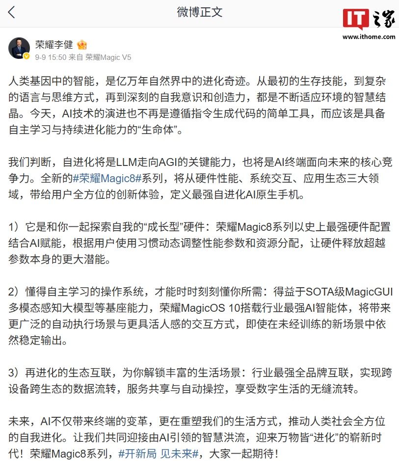 据alixixi此前报道,荣耀 CEO 李健 9 月 9 日发文透露,自进化将是 LLM 走向 AGI 的关键能力,也将是 AI 终端面向未来的核心竞争力。全新的荣耀 Magic8 系列,将从硬件性能、系统交互、应用生态三大领域,带给用户全方位的创新体验,定义最强自进化 AI 原生手机。