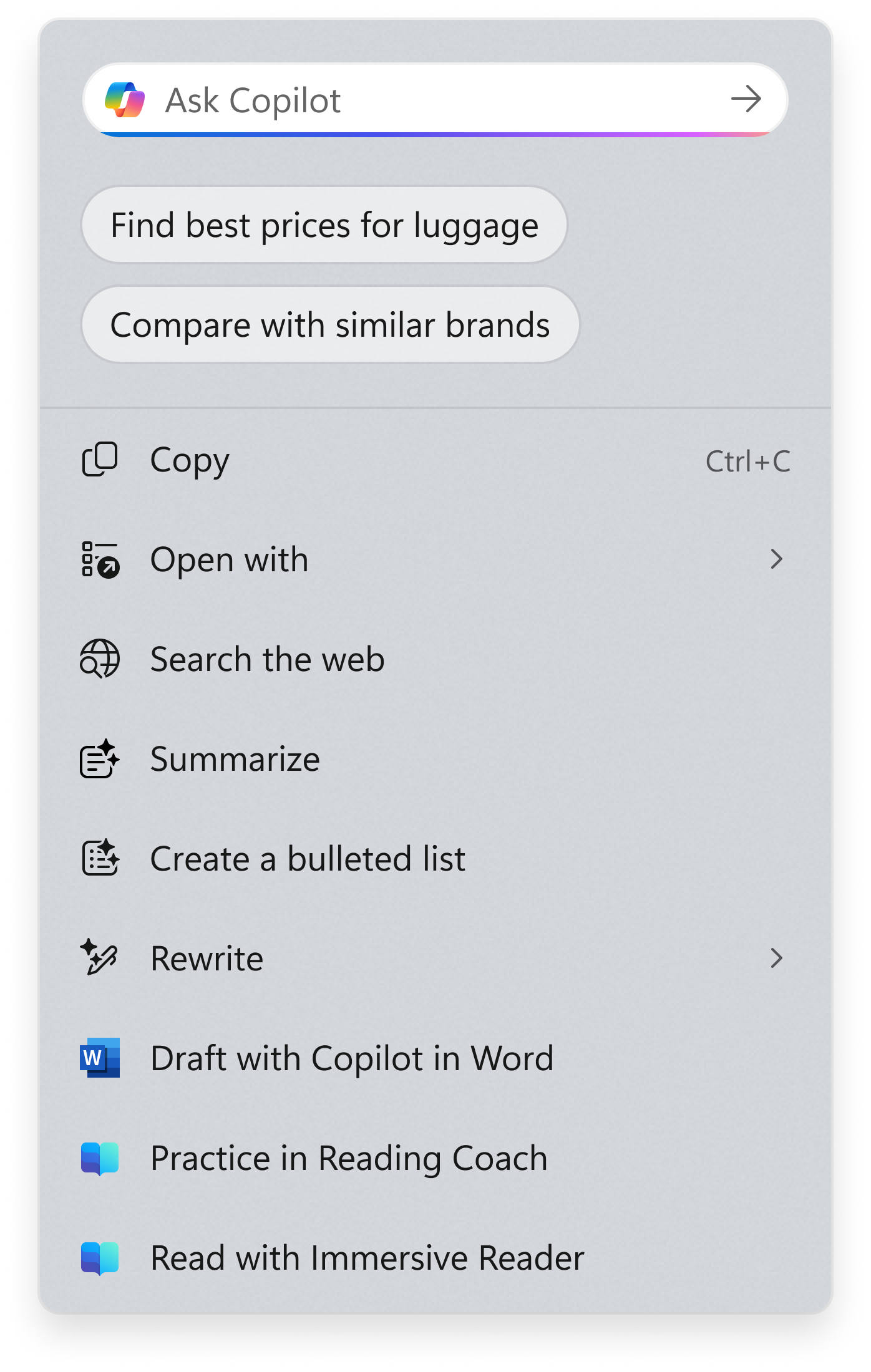 Copilot 提示框:Click to Do 中全新的 Copilot 提示框旨在简化用户与 Microsoft Copilot 的交互。此项增强功能有助于节省时间,并允许用户直接在文本框中输入自定义提示,然后该提示会与屏幕上所选内容一起发送到 Copilot。建议的提示也会显示在文本框下方,由 Phi-Silica 本地支持(仅支持文本选择,以及英语、西班牙语和法语)。此项更改尚未推广至 EEA(欧洲经济区)或中国的 Windows Insider 成员。