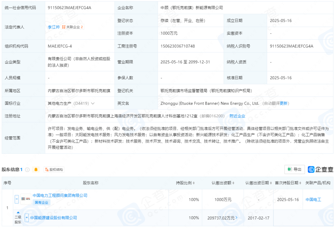 9月9日,内蒙古自治区投资项目在线审批办事大厅信息显示:中顾(鄂托克前旗)新能源有限公司提交的中电工程鄂托克前旗风光制氢一体化项目(光伏、储能及制氢部分) 能源类的项目备案项目,准予备案。