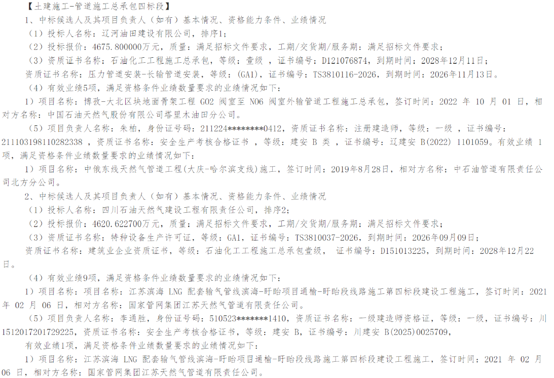 管道施工总承包中,分为6个标段,中交石油天然气管道工程有限公司、四川石油天然气建设工程有限责任公司、中国石油管道局工程有限公司、辽河油田建设有限公司、新地能源工程技术有限公司5家作为第一中标候选人入选。