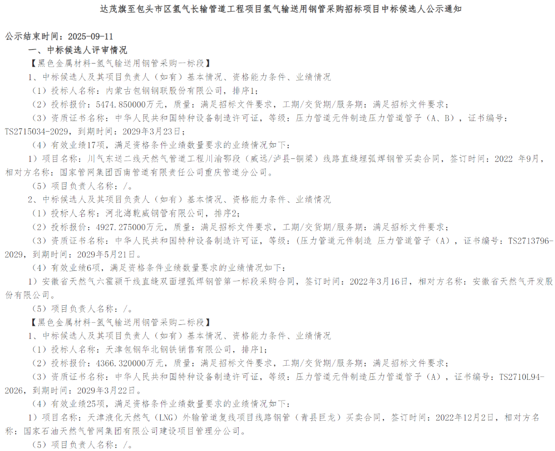 氢气输送用钢管采购中,分为3个标段,内蒙古包钢钢联股份有限公司、天津包钢华北钢铁销售有限公司、内蒙古君诚兴业管道有限责任公司3家作为第一中标候选人入选。