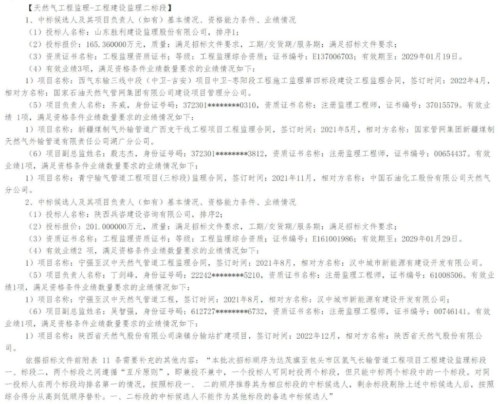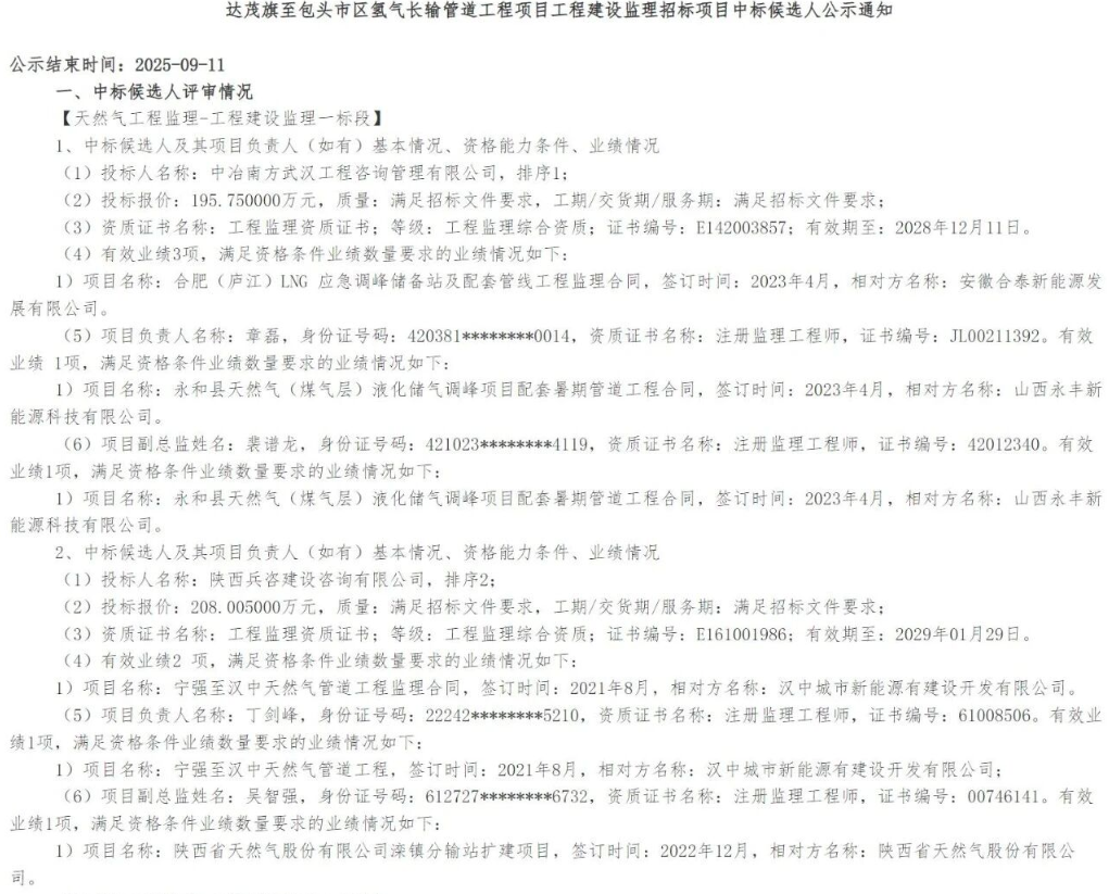 9月8日,华电集团新能源产业相关项目工程达茂旗至包头市区氢气长输管道工程项目管道施工总承包及氢气输送用钢管采购、工程建设监理中标候选人公示。