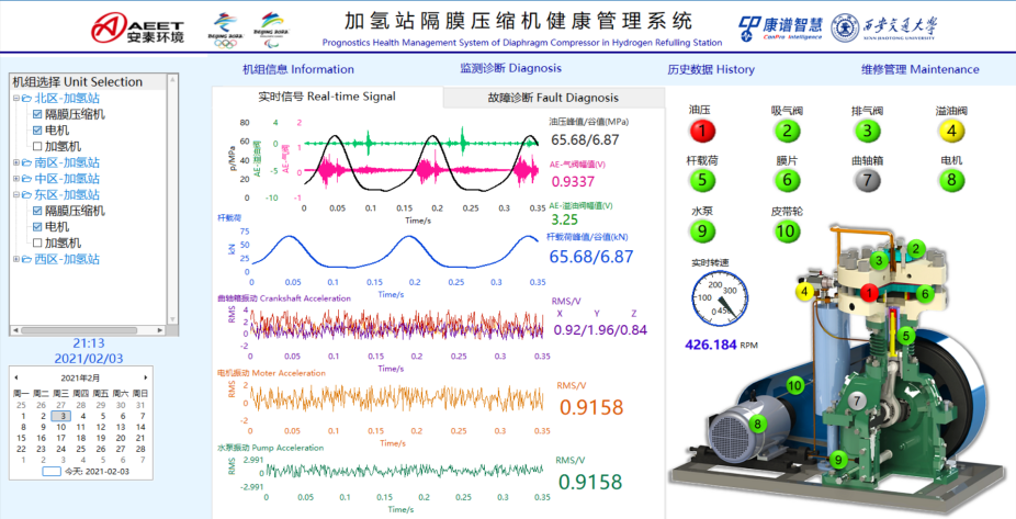 项目团队研发的加氢站用压缩机健康管理系统是国内首套针对加氢站隔膜压缩机的全周期状态监测、故障诊断、失效预警于一体的软硬件系统。