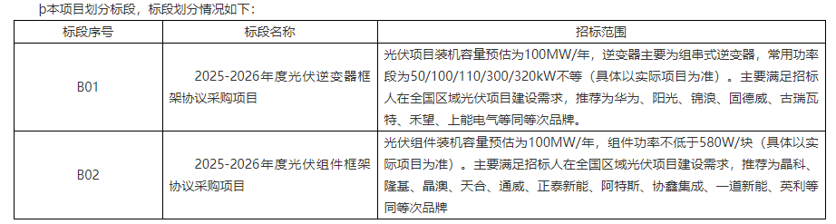 该招标项目分为2个标段,1标段为光伏逆变器框采项目,2标段为光伏组件框采项目,装机容量预估为100MW/年。