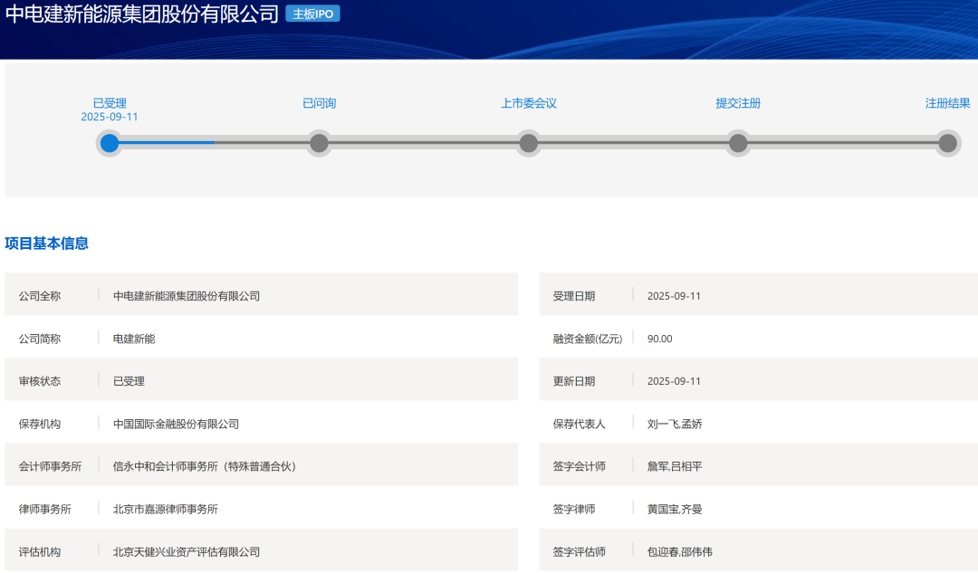 2025年9月11日,上交所官网显示,中电建新能源集团股份有限公司(简称:电建新能)主板IPO申请获受理。