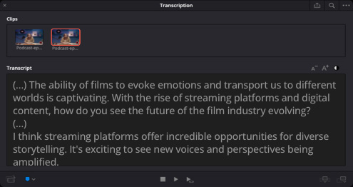 转录功能能够自动转录视频和音频片段!只需在媒体池内选择片段,然后使用菜单选择音频转录功能即可开始转录。您可以标记入点和出点编辑或删除文本,生成子片段,添加标记,甚至移除无声部分。