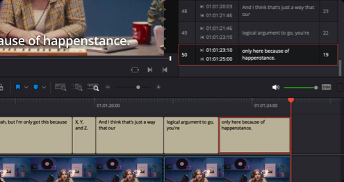 快编页面和剪辑页面上的自动字幕功能能够将时间线语音转文本自动转录进时间线上的字幕轨道。如要启用该功能,只需在时间线菜单中点击“从音频创建字幕”。分析完成后,点击单个字幕在检查器中修改。