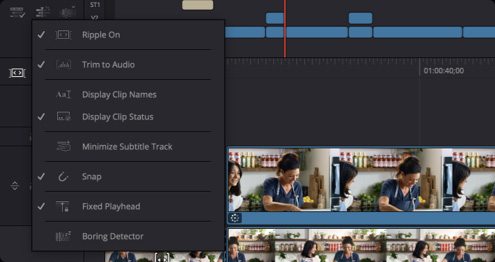 快编页面时间线添加了三个新菜单,提高了剪辑的效率和灵活性。使用时间线选项、时间线动作和编辑动作开关波纹编辑,修剪播放头编辑点,修剪及重新同步音频,以及更改时间线外观等!