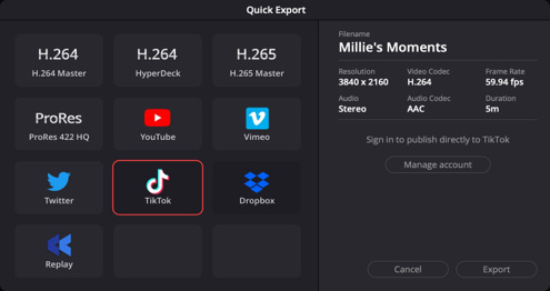 内容创作者可以直接向抖音上传视频。只需在偏好中登录您的抖音账户,然后使用交付页面中的渲染预设或者快速导出对话框。新的竖屏宽高比输出选项让社交媒体内容创作更加简单。
