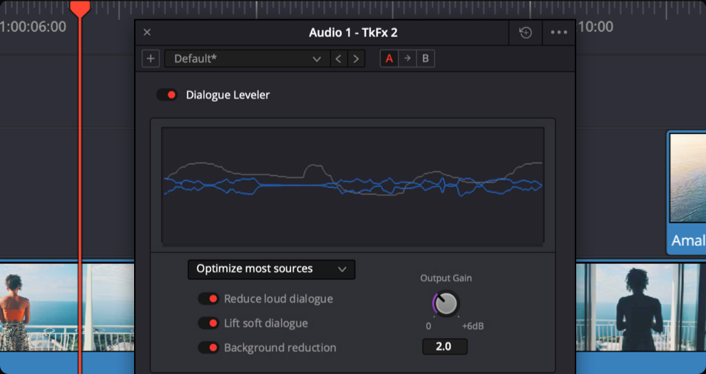 检查器中的对白电平轨道FX效果可以处理并平滑对白录音,无需对片段增益或自动化曲线进行繁琐的电平调整。可用控制包括实时滚动波形显示、焦点预设以及三个处理选项,可用来让您轻松获得自然的声音效果。