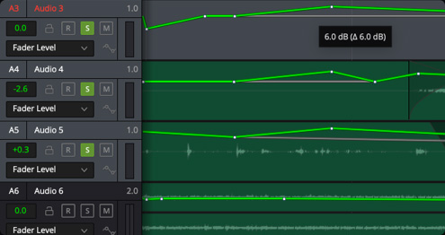 Fairlight轨道自动化曲线可通过关键帧进行修改,操作起来就像片段增益调整线一样简单。按住Option键点击可添加关键帧,或者使用铅笔工具绘制,直观地进行编辑、修剪,并使用标准工具来微调关键帧。工具提示会显示关键帧数值的变化,矢量自动化操作可获得线性流畅的电平变化。