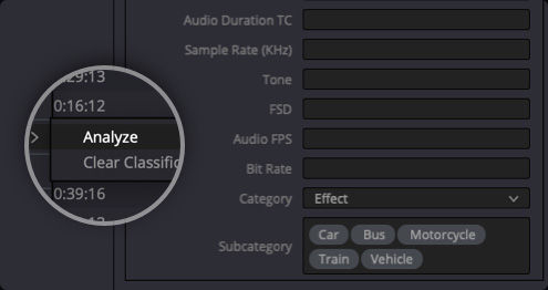 DaVinci Neural Engine能够根据内容对音频片段进行分类,在检查不熟悉的素材时提升剪辑选择的效率。分析结束后,音频片段会出现在对白、音乐和特效的素材媒体夹里,拥有详细的子类别,比如:爆炸、水或者昆虫等。