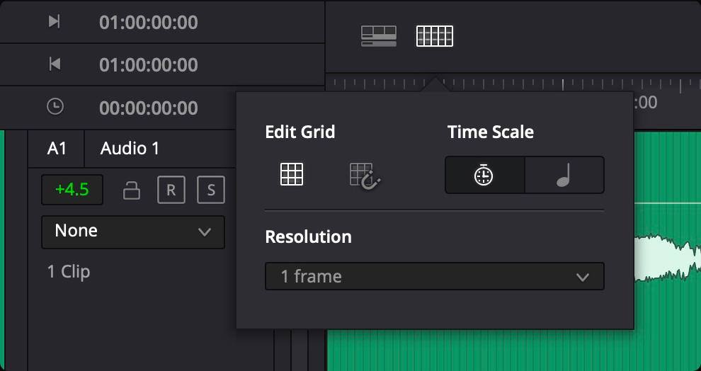 Fairlight的网格模式可以将片段放置在网格中,实现精准的时间调整。启用网格的吸附功能可以让您拖拽、修剪或微调片段时间码的时候获得精确的对齐效果。使用网格菜单可自定义网格线条的可见性、吸附功能、时间刻度以及分辨率,范围从1秒到1/4帧、1小节到1/16音符不等。