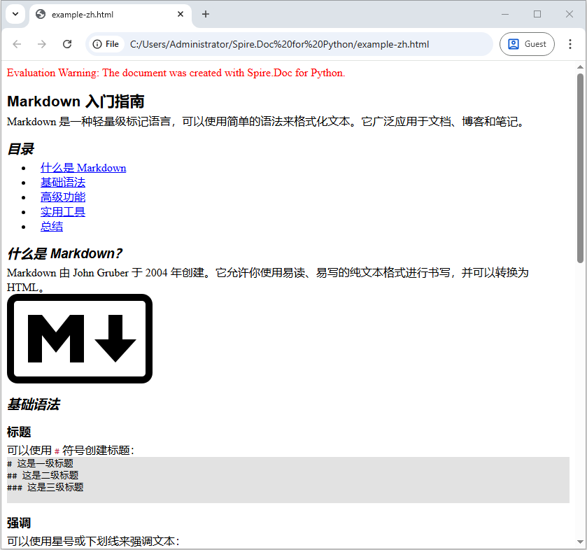 最后,在网页浏览器或 HTML 编辑器中打开生成的 example-zh.html 文件,确认 Markdown 内容是否已正确转换。
