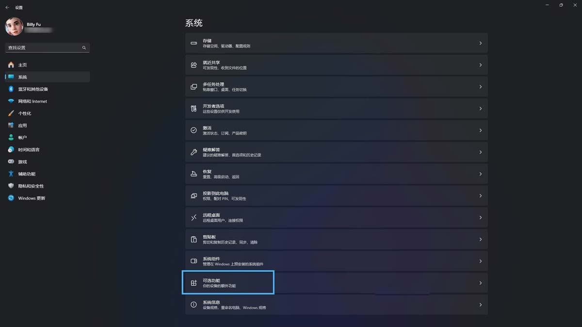 1、使用Windows + I快捷键打开「设置」,进入「系统」>「可选功能」。
