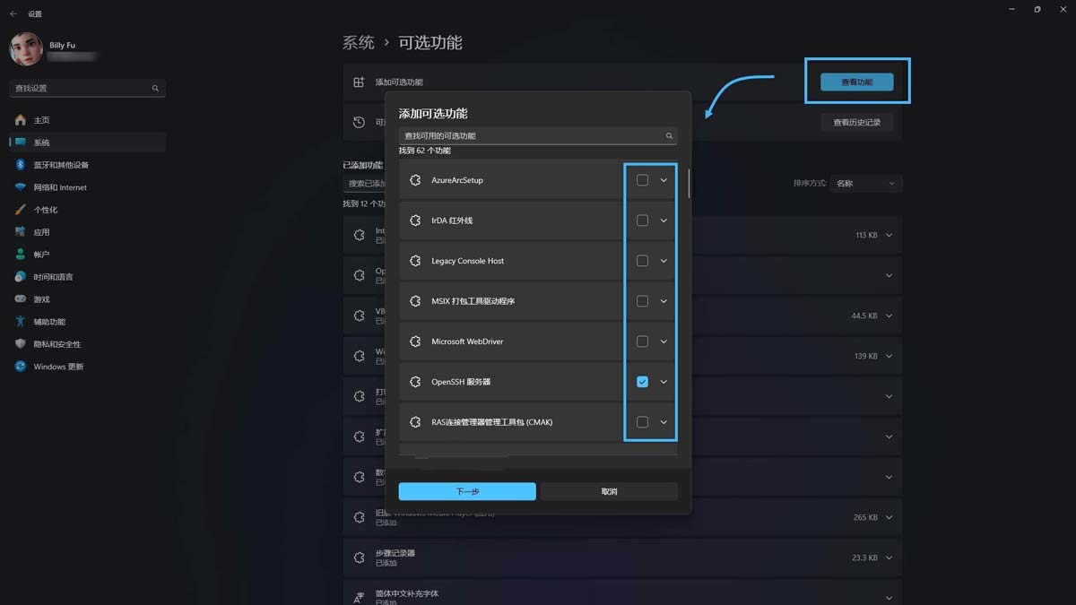 3、在弹出的功能列表中,勾选需要添加的功能,然后点击「下一步」。