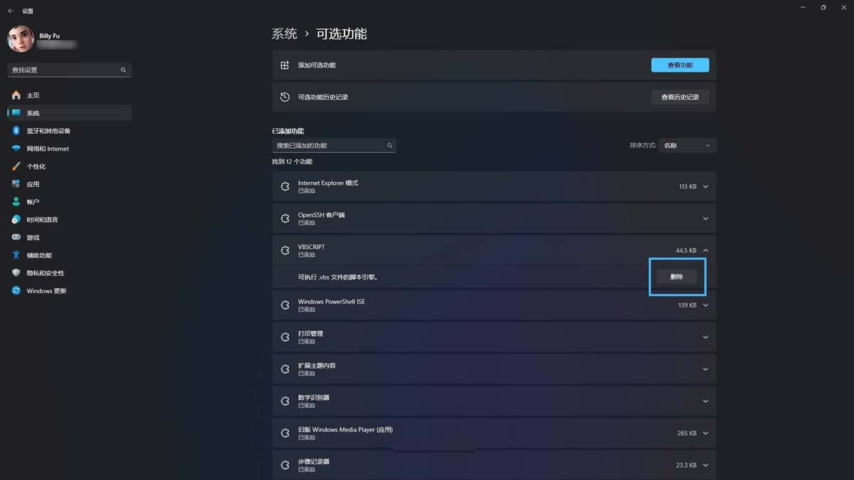 2、在「已添加功能」列表中,找到并展开要移除的功能,然后点击「删除」。