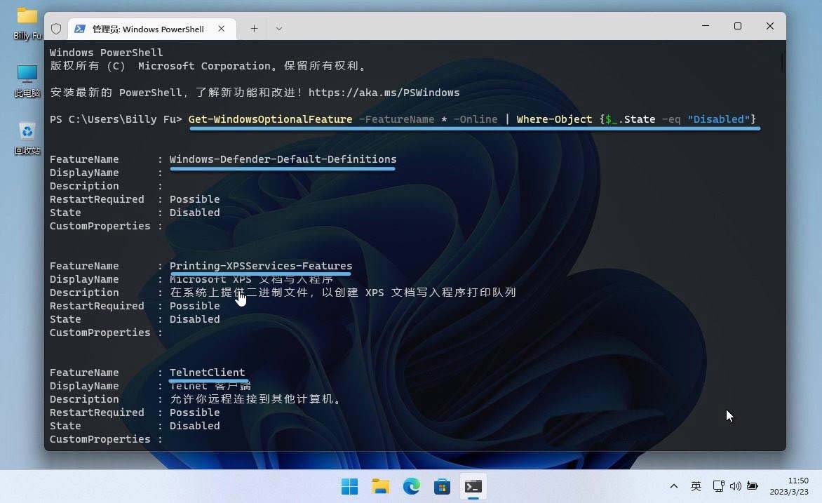 使用 PowerShell 查看已禁用的 Windows 11 功能
