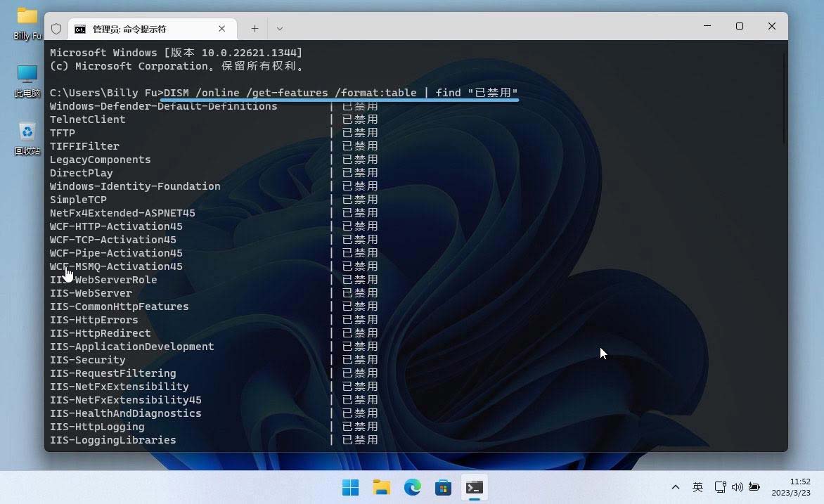3、使用 DISM 命令获取当前已禁用的功能列表: