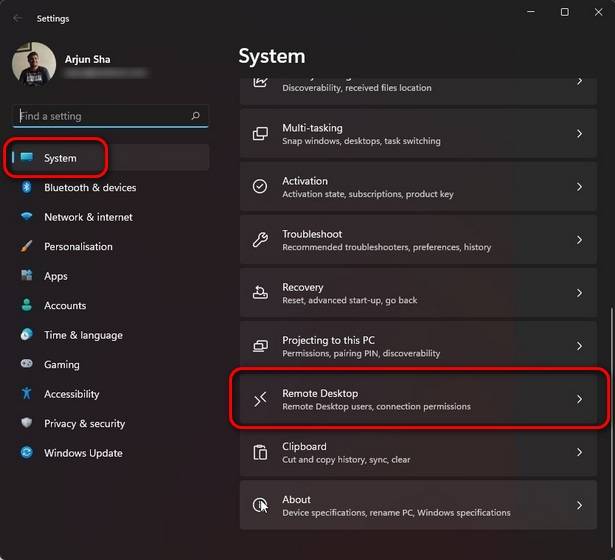 打开设置(使用Windows 11 键盘快捷键Win + I)并单击左侧边栏上的“系统”。现在,在右侧窗格中选择“远程桌面”。
