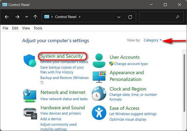 在控制面板中,确保您使用的是“类别”视图并选择“系统和安全”选项。