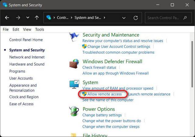 在下一页上,单击“系统”下的“允许远程访问”。您现在将看到一个弹出窗口,其中包含连接到远程桌面的选项。