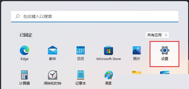 2、打开的开始菜单中,找到并点击所有已固定应用下的【设置】;
