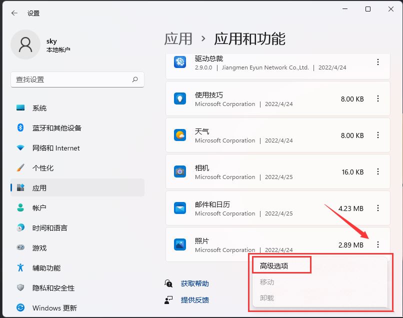 4、当前路径为:应用 > 应用和功能,找到并点击照片最右侧的【几个小点】,在打开的选项中,再点击【高级选项】;