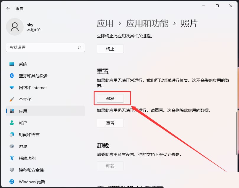 5、往下,找到并点击【修复(如果此应用无法正常运行,我们可以尝试进行修复。这不会影响应用的数据。)】;
